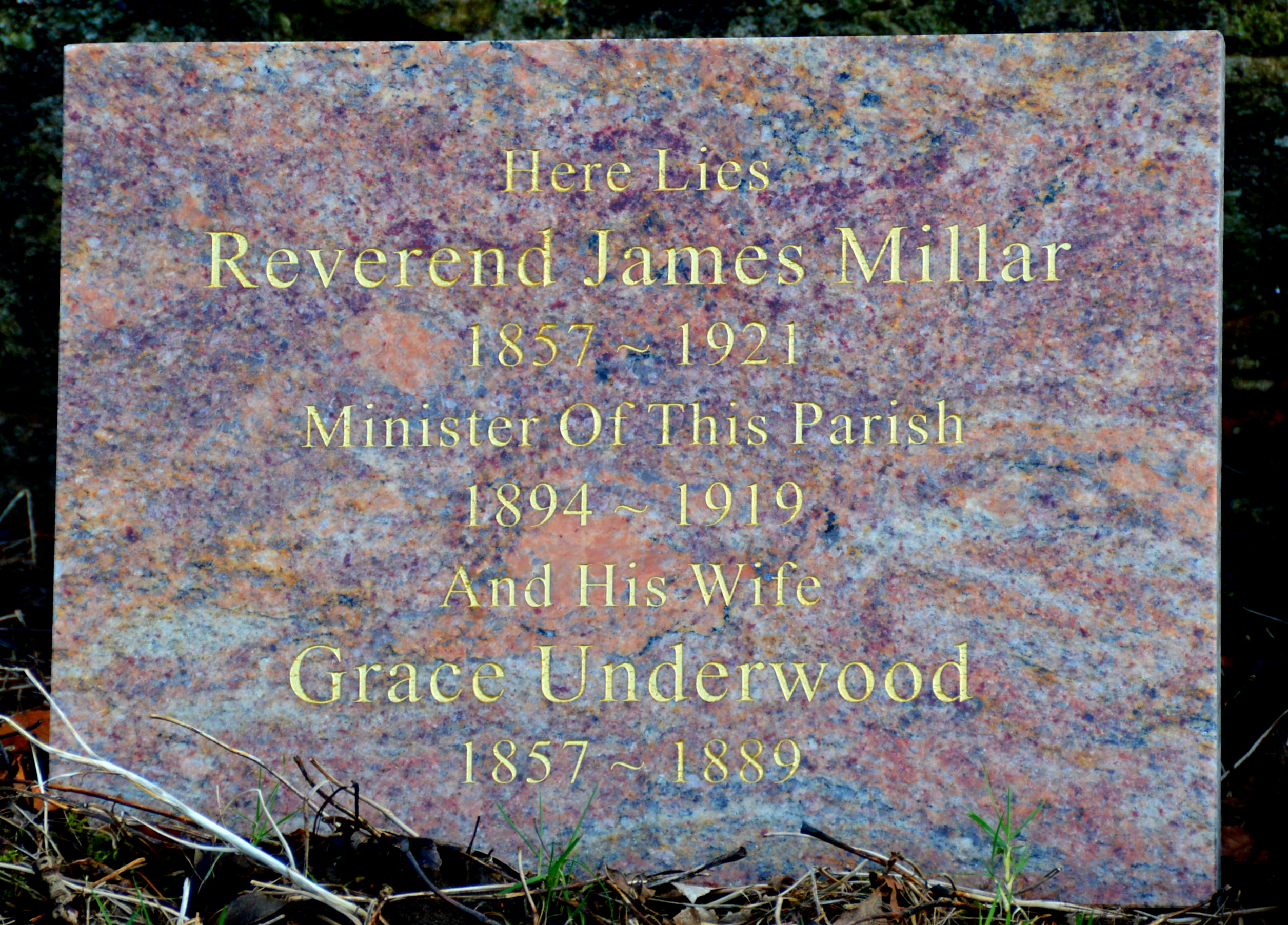 Unfortunately the original small cross headstone that marked the resting place of the Reverend James Millar and his wife Grace Underwood Kennedy has been irreparably damaged. As part of the project a new memorial plaque has been placed beside it.