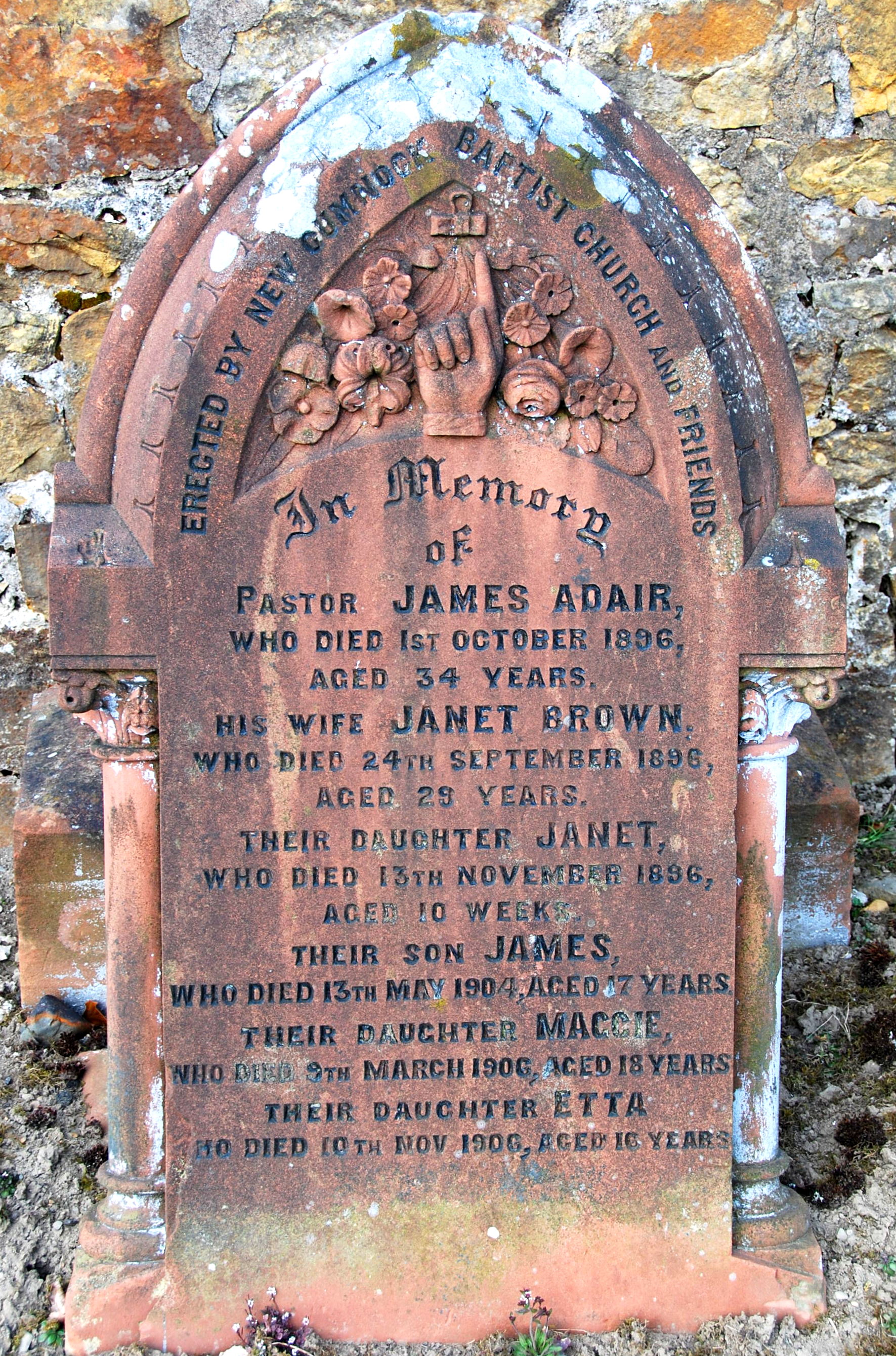 In 1896 tragedy struck the Adair family in devastating fashion. On the 7th September daughter Janet Brown Adair was born at Craigard but sadly her mother died on the 24th September and one week later her father Pastor James Adair died at home at Craigard. Tragically the orphaned baby died 10 weeks after her birth and all three were laid to rest in the Auld Kirkyard, New Cumnock. The remaining five orphans went to live with their grandmother Henrietta Adair who later lived in Rutherglen with several of her unmarried children.