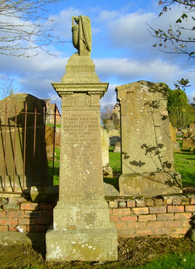Headstone of Thomas Kirkland and Jean Peden (who died in Bank House, New Cumnock) in Sorn Kirkyard. Son Hugh Kirkland and his wife Catherine Campbell rest here too.