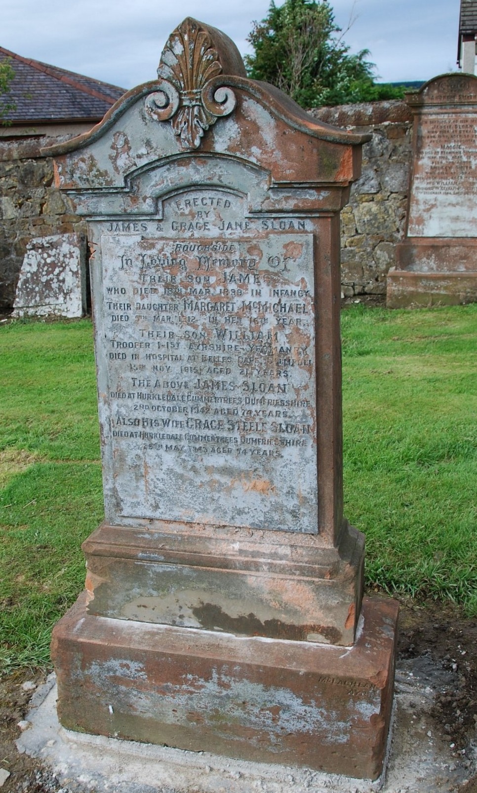 We deeply regret to learn that Tpr. William Sloan, of the Ayrshire Yeomanry – son of Mr. James Sloan of Roughside, and grandson of Mr. William Sloan, Castlemains, – has died at the Dardanelles.