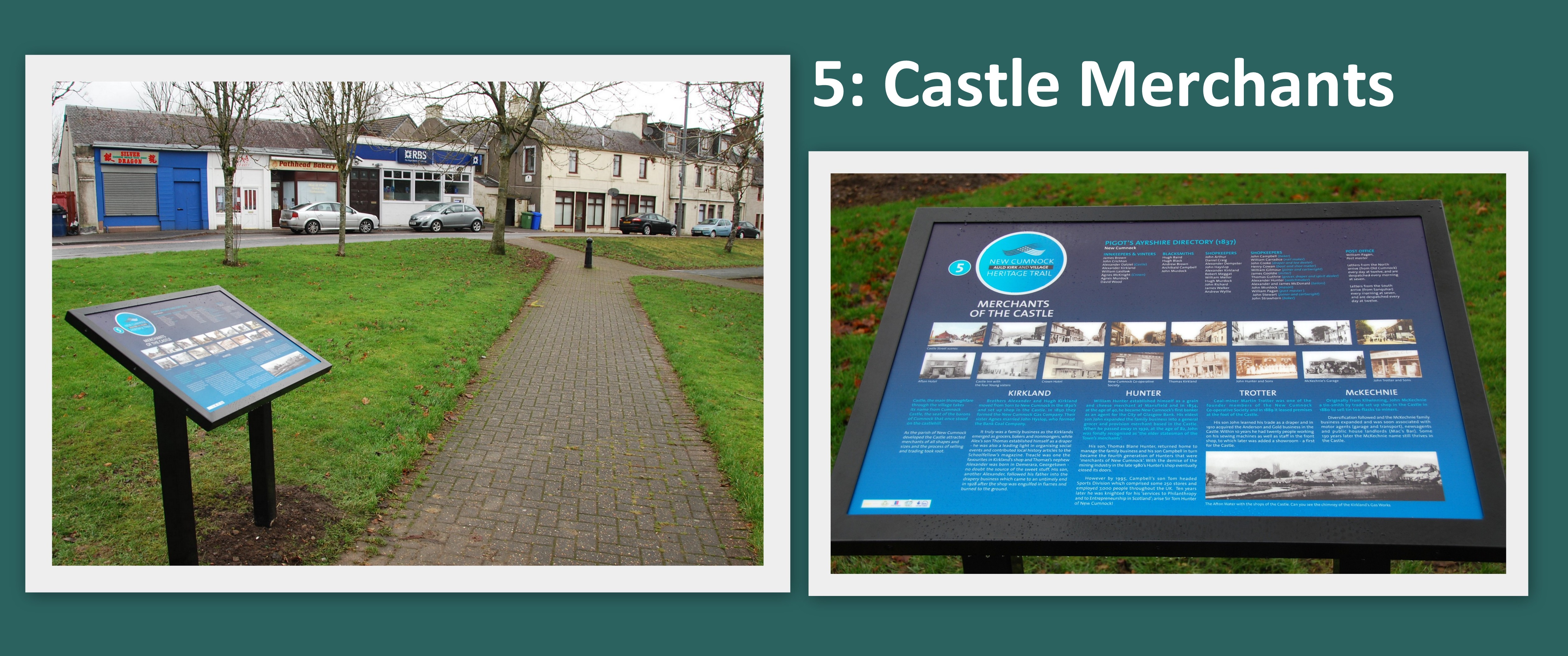 The trail runs the length of the Castle (the main thoroughfare through the village) from the Railway Station to the Old Mill Toll with interpretation and information boards as following –