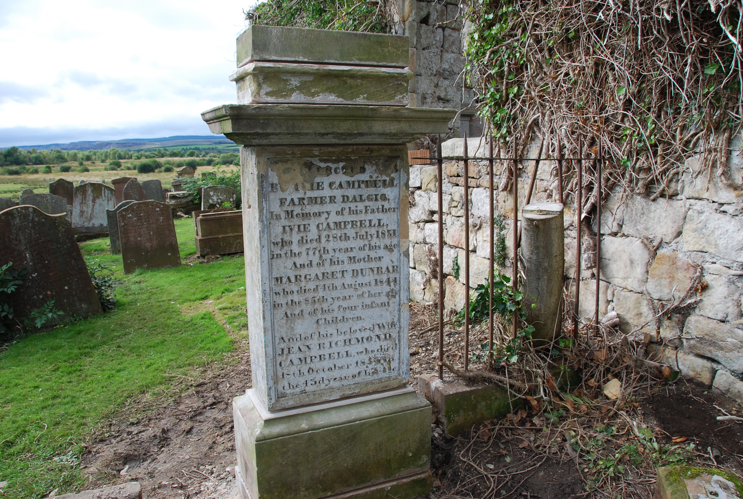 The story of William Campbell, Laird of Dalhanna can be found in the section on the ‘Heritors of New Cumnock (1833)’ at New Cumnock History. He married Margaret Crawford Young, the daughter of the Reverend James Young minister of the parish of over 50 years and remembered as ‘Jamie Goose’ in Robert Burns’ attack on the church “The Kirk’s Alarm”. Together William and Margaret had 12 children, all named on the family headstone, made up of 7 sons and 5 daughters.