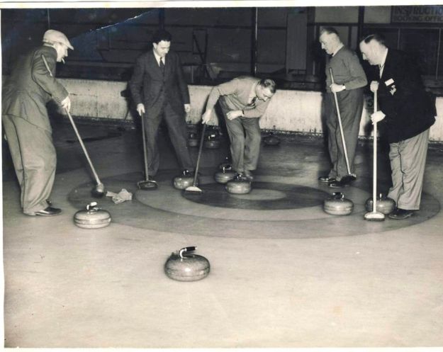 New Cumnock Curling Rink playing at Ayr Ice rink, George Gilbert bending over