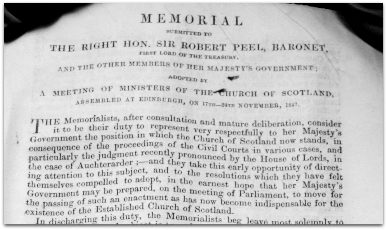 A Meeting of Ministers of the Church of Scotland assembled at Edinburgh on 17th -24th November 1842 resulting in the above memorial [ Scots Law ‘ a statement of the particulars of a case‘] being submitted to the Prime Minister, Robert Peel and his government. The ‘case of Auchterarder’ is cited as a cause for concern. It was here in 1834 that the parishioners unanimously rejected the patron’s nominee and refused to proceed to his ordination and injunction. The nominee appealed to the Court of Session in 1838 which held the Church in applying the Veto Act had acted beyond their powers. The Court went further and ruled that the established Church was a creation of the State and that it derived its legitimacy by Act of Parliament. The issue of patronage now esclated to the spiritual independence of the Church , which was now clealry on a collision course with the State.