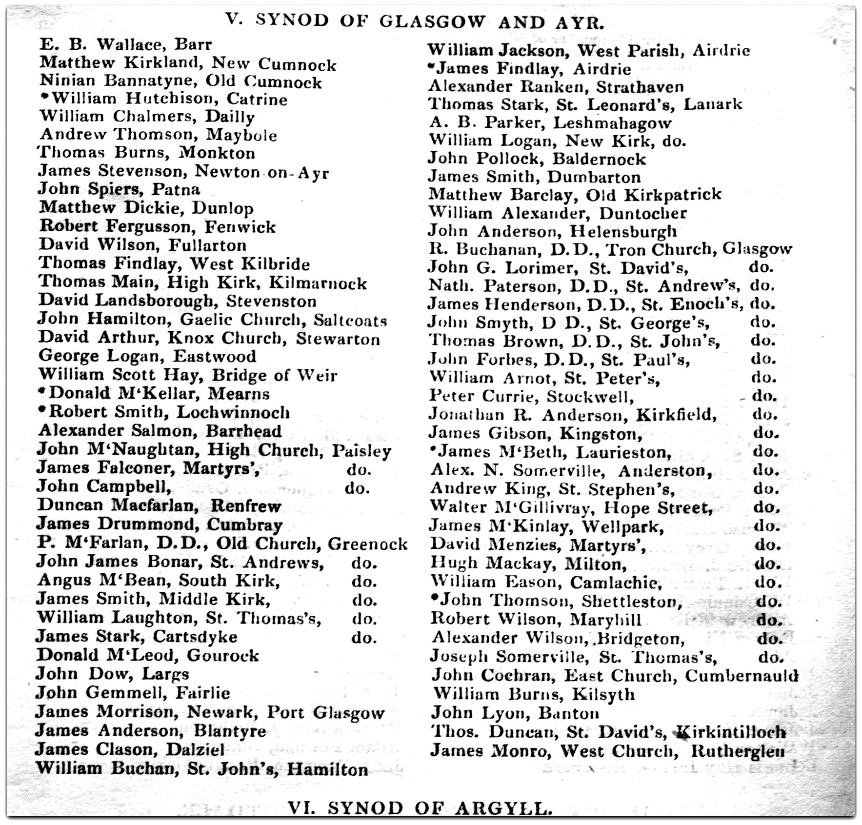 Included in the list are the Rev. Matthew Kirkland, New Cumnock and Rev. Ninian Bannantyne, Old Cumnock. So too, the name of Rev. David Arthur, Knox Church, Stewarton, the son of David Arthur farmer at Wellhill, New Cumnock and brother of William Arthur.