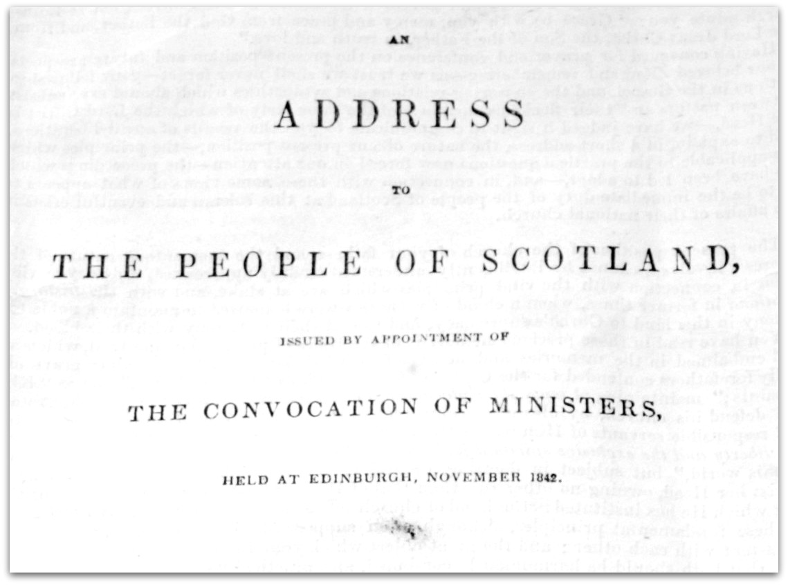 The “Address to the People” rendered it unavoidable for the whole community to consider their own duty in the matter, and to determine whether they were prepared to permit their religious liberties to be utterly subverted and the Church of their fathers overthrown, without one constitutional and legal attempt to save them. [‘History of the Church of Scotland: From the Introduction of Christianity to the Period of the Disruption’, Rev. W.M. Hetherington (1843)]