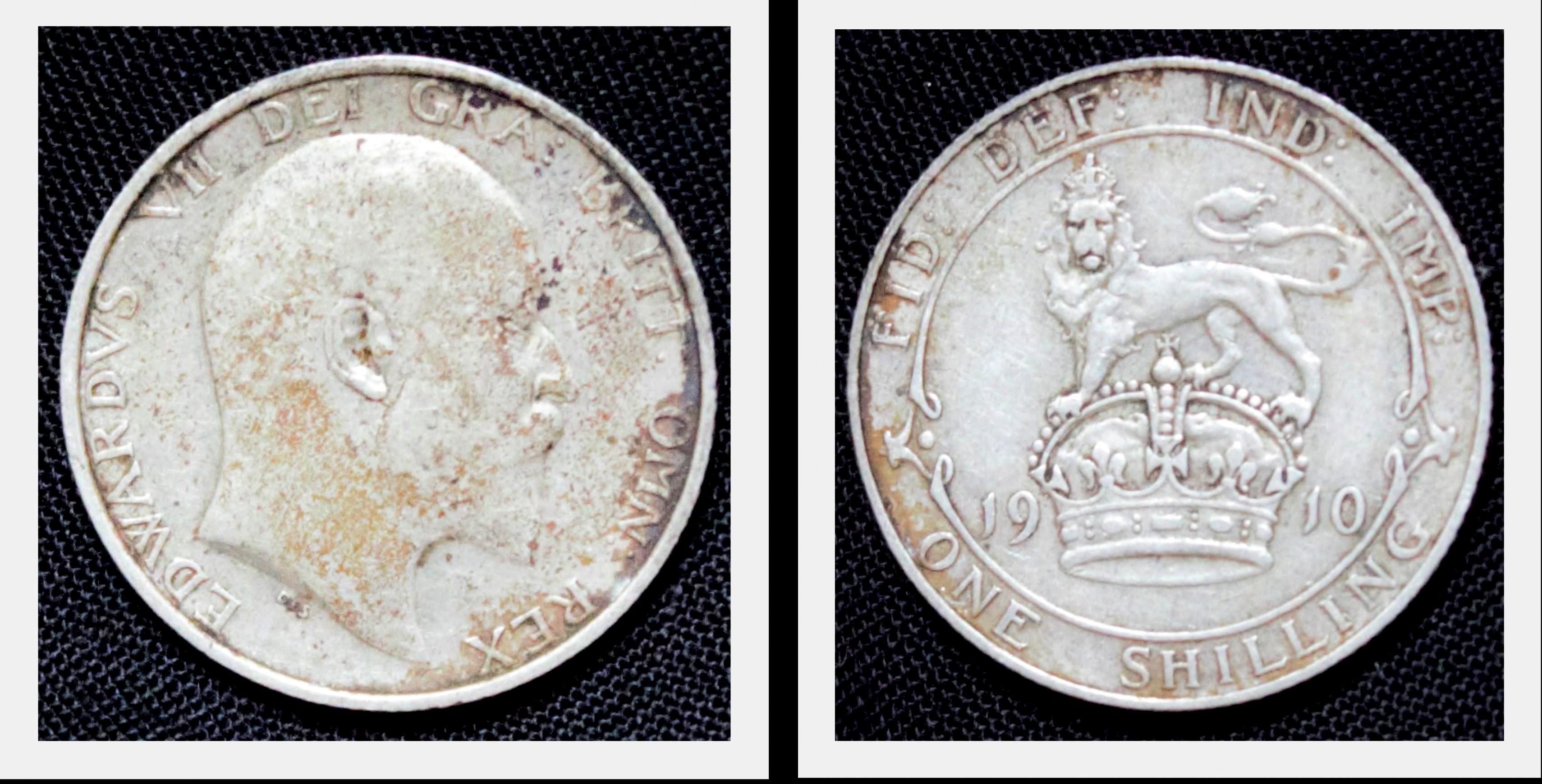 Tail:FID:DEF:IND:IMP ONE SHILLING (1910) CROWN and LION (standing left)
