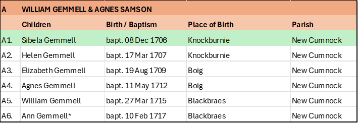 N.B. It has been assumed that the Sybella Gemmell, wife of Hugh Murdoch is the daughter of William Gemmel and Agnes Samson.