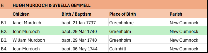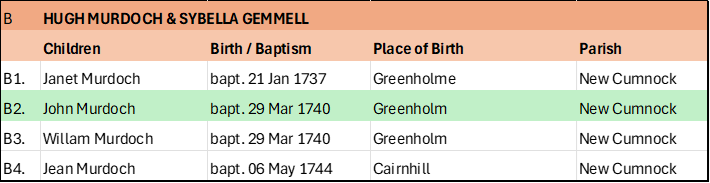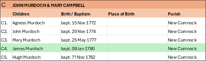 John Murdoch married Mary Campbell, a very common surname in the parish and thus far it has not been possible to identify her parents*. Furthermore, this generation of Murdochs were born during the period that many of the baptism records in the parish of New Cumnock did not include the place of birth in the parish.