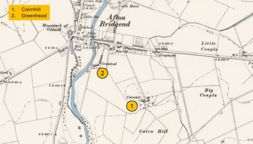 It is perhaps worth noting that the row of houses known as Greenhead sits less than a mile from Cairnhill farm close to the banks of the Afton Water. Perhaps part of the land between Greenhead and the Afton once housed Greenholm, but unlikely.