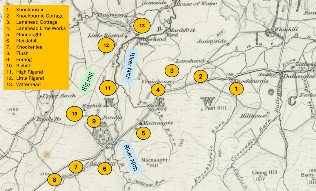 Throughout this period, it is inevitable to encounter variations in the spelling of Proper Nouns. Examples of family names include – Murdoch & Murdock; Mathew & Matthew; Morison & Morrison and Hyslop, Hislop & Heslop. As for placenames the most common encounters are those containing the element Scots rigg, rig ‘ridge’ leading to names as Riggend & Rigend, Forerigg and Fore-Rig etc. The Murdoch family tenanted several farms on the Estate of Waterhead Estate and these are shown below.