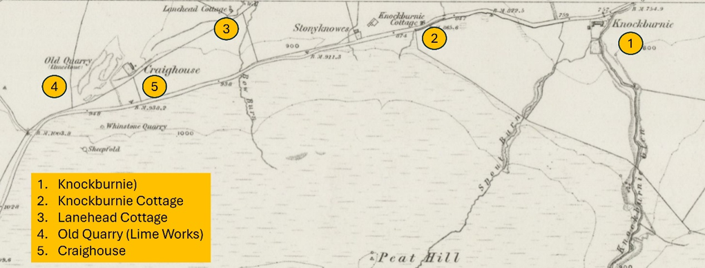 Soon after, the family settled at Lanehead Cottage associated with the Lanehead Lime Works, a few hundred yards away. Here five more children – John, Mathew, Ann, William and Katrine were born in the period 1815-1823.