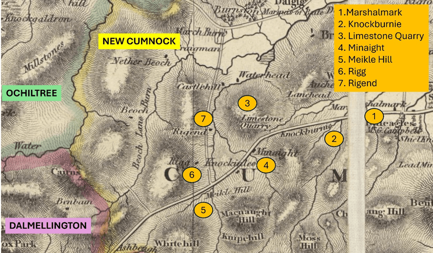 ‘Johnston’s map of the county of Ayr’, illustrates well the above-named farms to be let by the Estate of Waterhead by Whitsunday 1845 (15th May), as well as showing the Limestone Quarry.