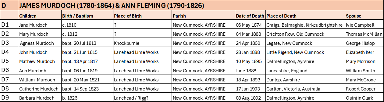 The research now turns to the James Murdoch (b.1780) and his wife Ann Fleming (b.1790) and their descendants, living and working on the Estate of Waterhead, and beyond.