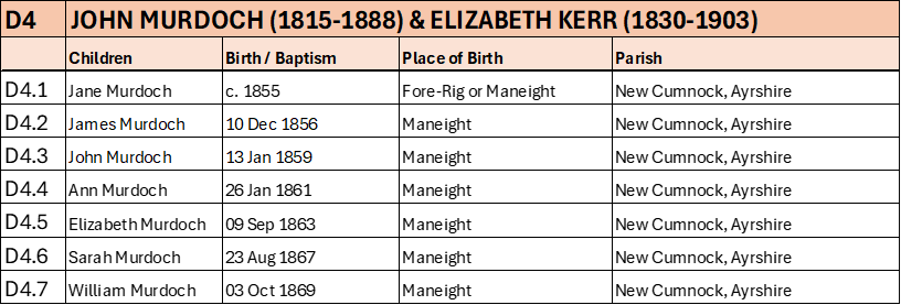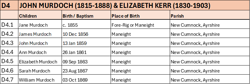 By the time of 1861 Census, John Murdoch, dairyman, his wifeElizabeth Murdoch were settled at Maneight along with their four children. Elizabeth, the eldest was born in 1855 (no baptism/birth-date record) and it is not clear if she was born at either Fore-Rig or Maneight. The other children James (b.1856), John (b.1859) and Ann (b.1861) were all born at Maneight.