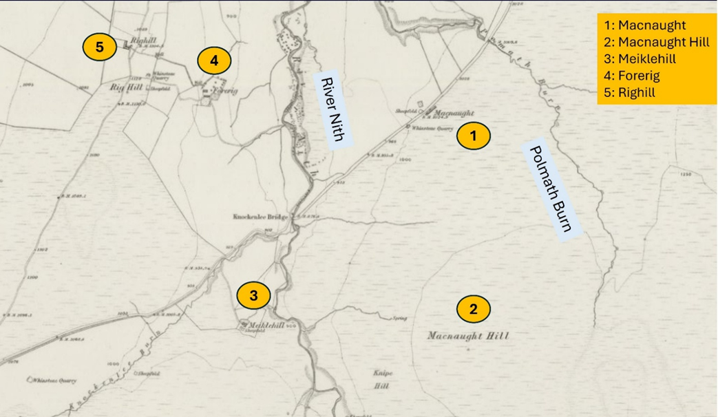 In September 1854 the Estate of Waterhead listed a number of farms on the estate to be let for the period of 15 years, including Fore-Rigg, with the entry to the House, Meadows and Pastures on Whitsunday 1855 (15th May). However, although John Murdoch did not continue the tenancy of Fore-Rigg, he did take that of Maneight (also known as Macnaught), the lands of which are described as –