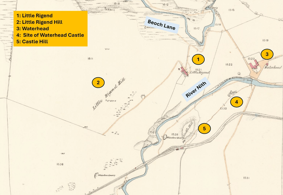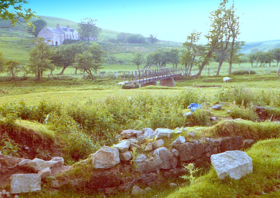 The photograph above was taken in the late 1970s when I was member of a group from the New Cumnock Local & Natural History that were ‘excavating’ the ruins of Waterhead Castle. The farm was abandoned at that time. In 1994 a Desk-bound survey was commissioned by the landowners of a proposed opencast site. Soon after, extensive opencast coal activity was carried out around this upper stretch of the River Nith. Nothing now remains of Little Rigend farmhouse.