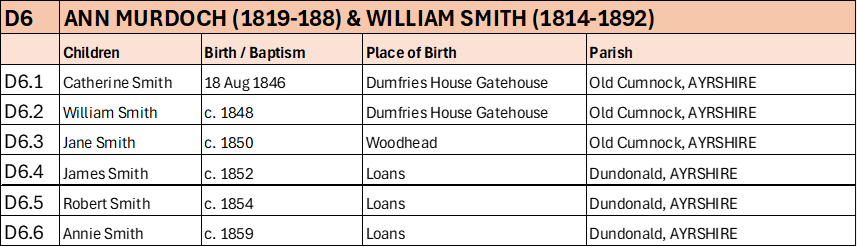 On 19th June and 21st June 1846, William Smith (Old Cumnock) and Ann Murdoch (New Cumnock) entered their proclamation of banns of marriage at Old Cumnock Parish Church and were married on 3rd July 1846. The couple settled at Dumfries House Gatehouse, one of the residences of the Marquis of Bute, the leading landowner in the parishes of Old Cumnock and New Cumnock. Other titles of Marquis of Bute, include Earl of Dumfries and Baron Cumnock (Old & New).