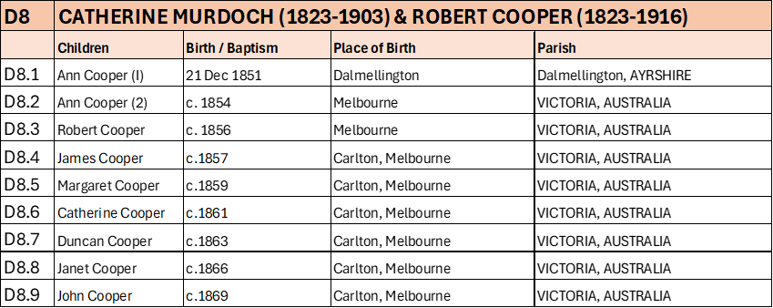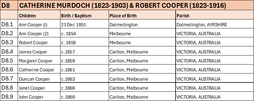 The baptism record of their first child reads “Ann 1st child of Robert Cooper and his wife Catherine Murdoch born 21st. Dec 1851, and baptized 11 Jan 1852, by the Revd. Wm. Gilchrist.” Sadly, Ann died in infancy.