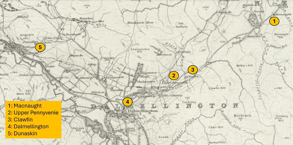 At the time of the 1841 Census the family of Robert and Mary Cooper and their 8 children were living at Upper Pennyvennie, while at the neighbouring farm of Clawfin, William (18) and Robert Cooper (15), presumably their sons, were working as farm servants. By the 1851 Census the Cooper family had moved to the neighbouring to Clawfin along with four of their grown-up family while son Robert (27) was lodging with a shepherd and his family at Dunaskin, to the northwest of the town of Dalmellington, whilst working as a labourer at the nearby furnaces