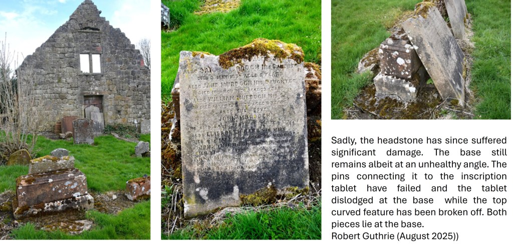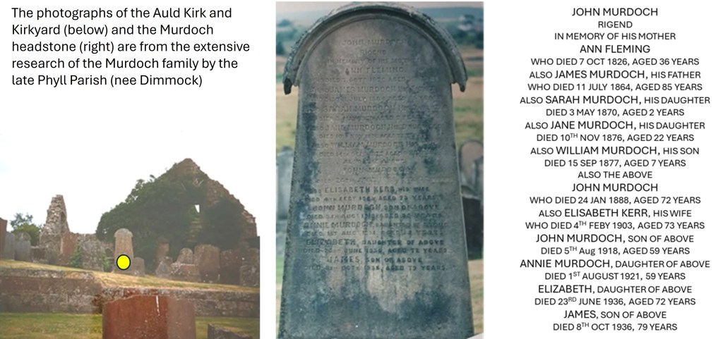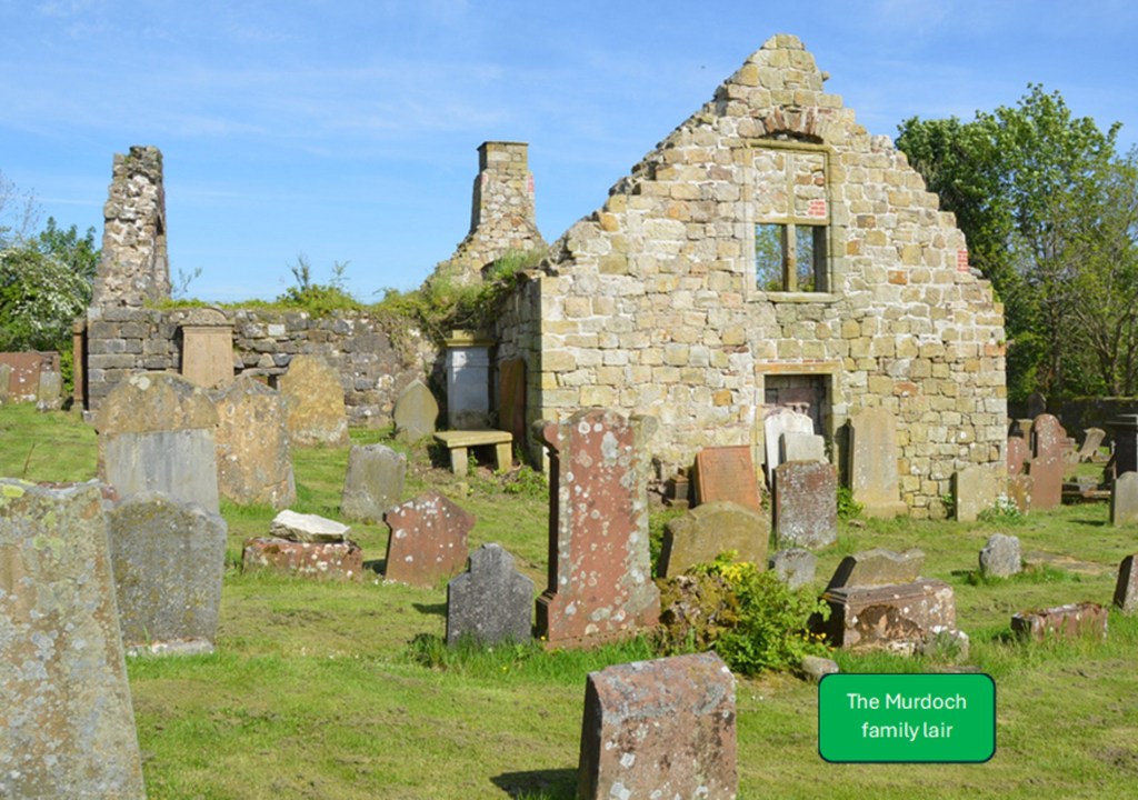 The Auld Kirkyard served as the graveyard, not all burials supported with a headstone and of course many headstones have suffered through time. The family lair of James Murdoch & Ann Fleming sits at the west end of the kirk, close to the original door into the kirk. The headstone was erected by his son John Murdoch and the lair also serves for the family of John and Elizabeth Kerr.