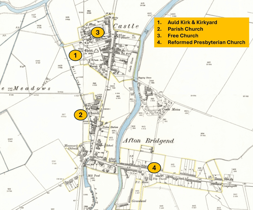 In the late 18th Century there was a small number of dissenters from the Established Church. The numbers slowly increased, and a small meeting place was built at Afton Bridgend c. 1809. By 1866 the Congregation had continued to increase and a fine new church with seating for 300 and an adjoining manse were built. In 1876 it joined the Free Church and was known as the Afton Free Church and in 1900 as the Afton United Free Church.